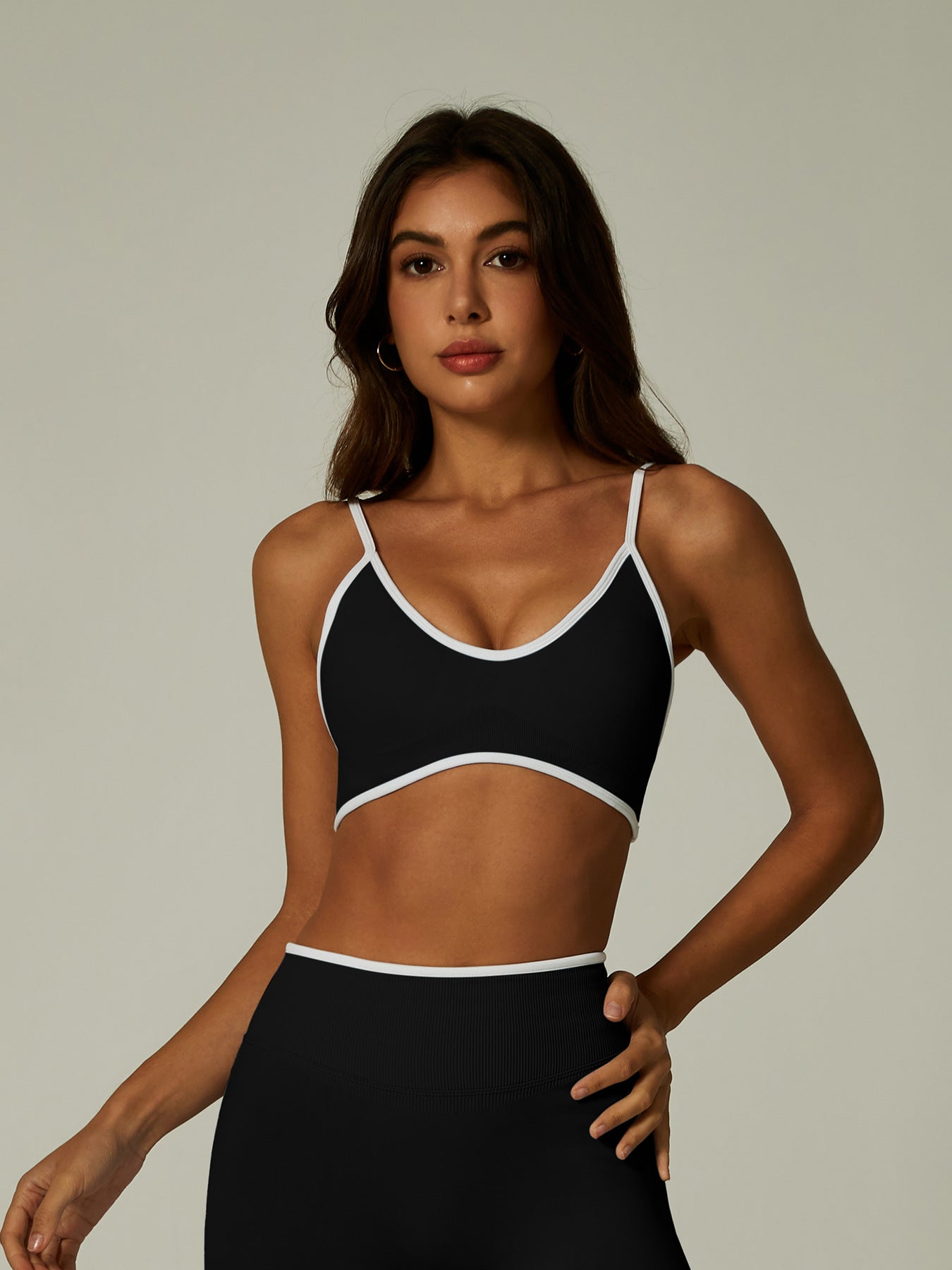 L'attrait de cet ensemble réside dans son design à la fois moderne et pratique. Les blocs de couleurs apportent une touche énergisante, tout en étant facilement assortis à d'autres vêtements sportifs ou de détente. Le dos nu et les coutures invisibles assurent non seulement un confort optimal, mais aussi une silhouette fluide et sans contrainte. Parfait pour une tenue de sport qui allie style et performance, il se porte aussi bien en salle de sport qu'à la maison.