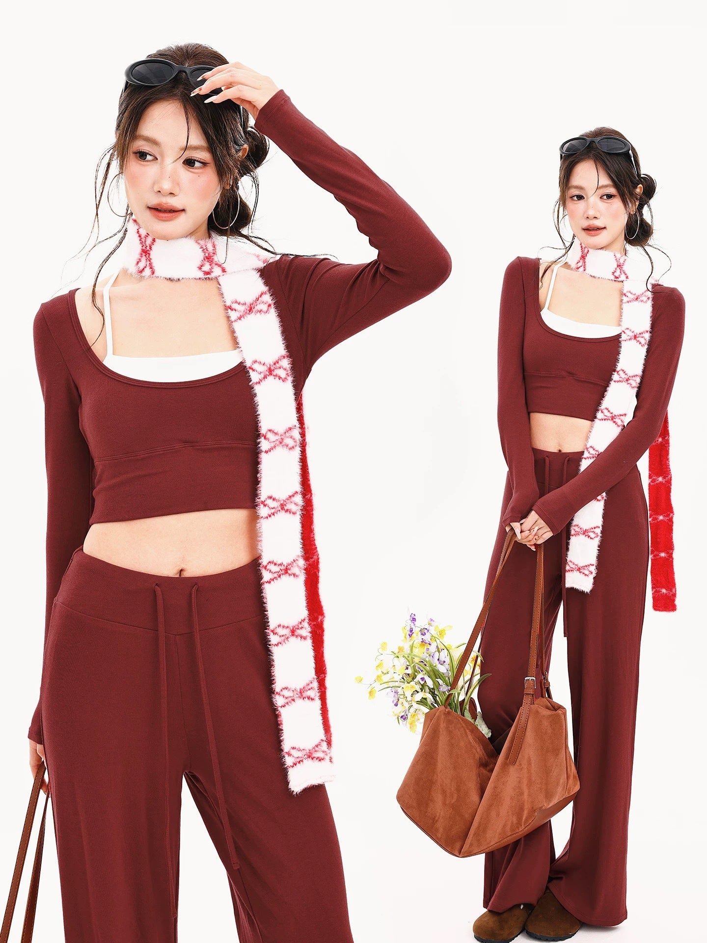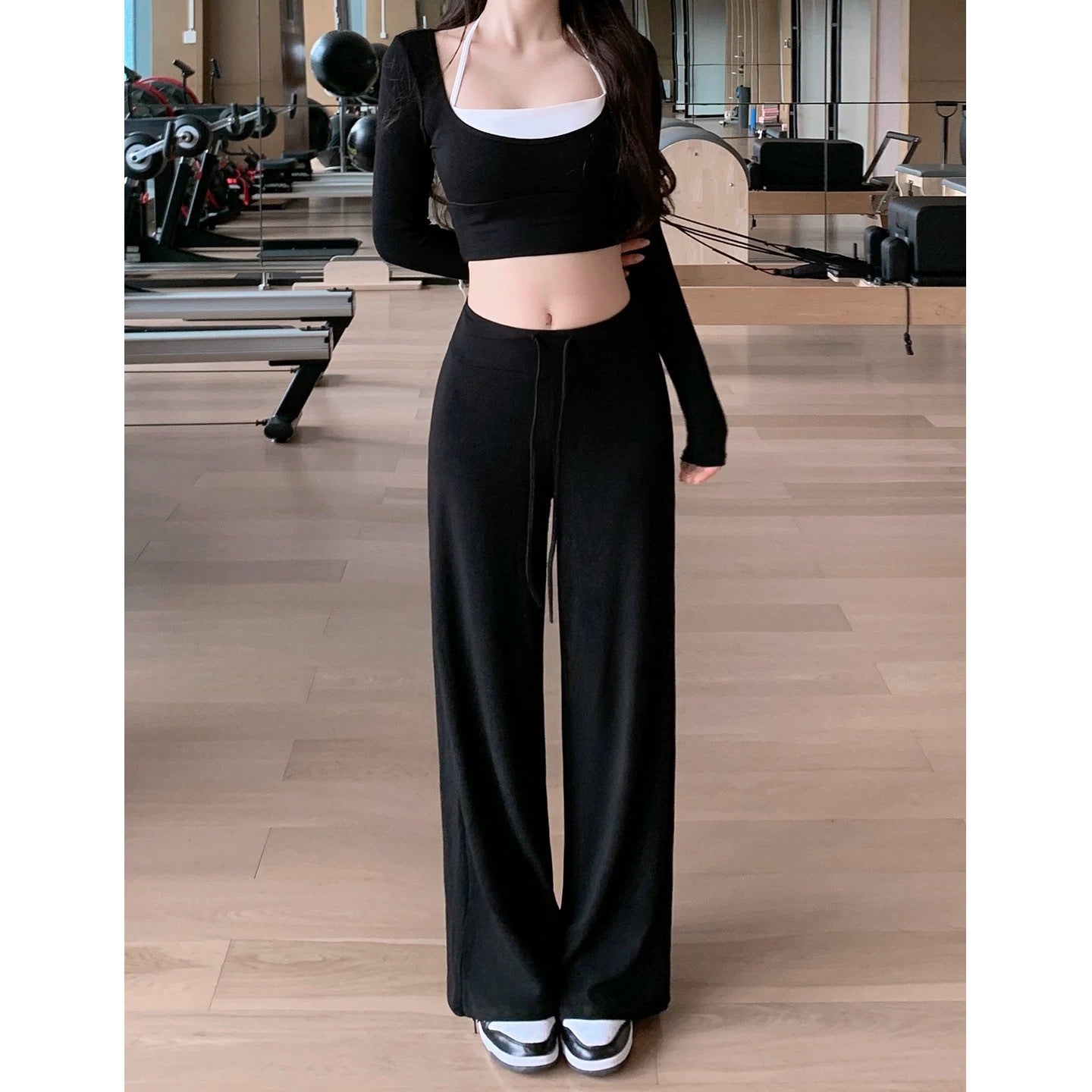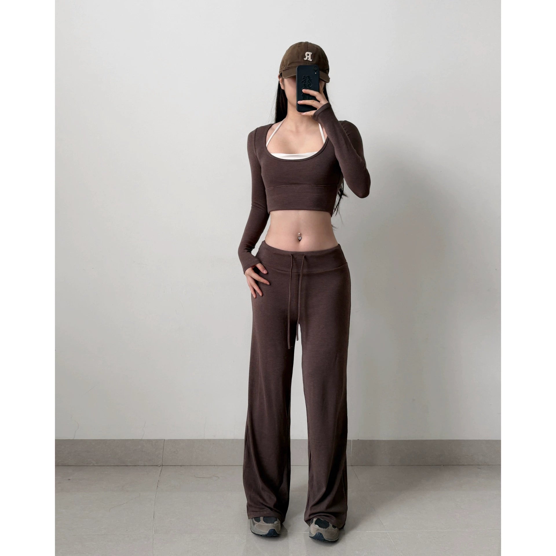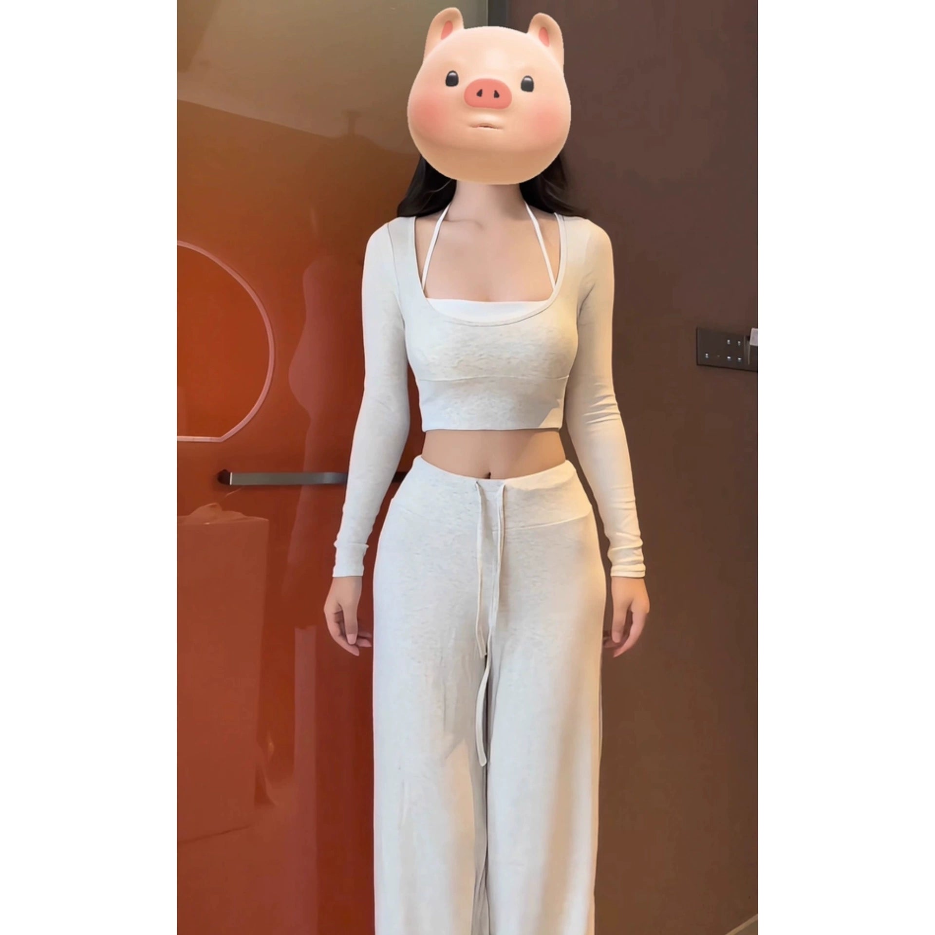 L’ensemble se distingue par sa simplicité élégante. Sa couleur douce et apaisante met en valeur sa coupe raffinée, et son tissu léger assure une grande liberté de mouvement. Le col licou et les manches longues apportent une touche d'élégance subtile, tandis que le pantalon à jambes droites complète l’ensemble pour un look à la fois sportif et chic. Idéal pour les séances de sport, il peut également être porté en tenue décontractée à la maison, pour une silhouette stylée en toute circonstance.